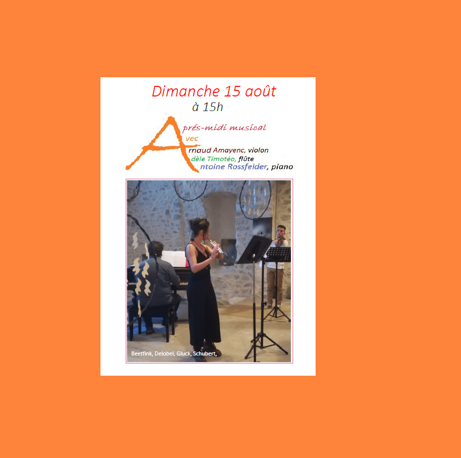 Après-midi musical dimanche 15 août avec Arnaud Amayenc, violon, Adèle Timotéo, flûte, Antoine Rossfelder, piano Voir détails Partager : Cliquer pour partager sur X(ouvre dans une nouvelle fenêtre) X Cliquez pour partager sur Facebook(ouvre dans une nouvelle fenêtre) Facebook J’aime chargement…